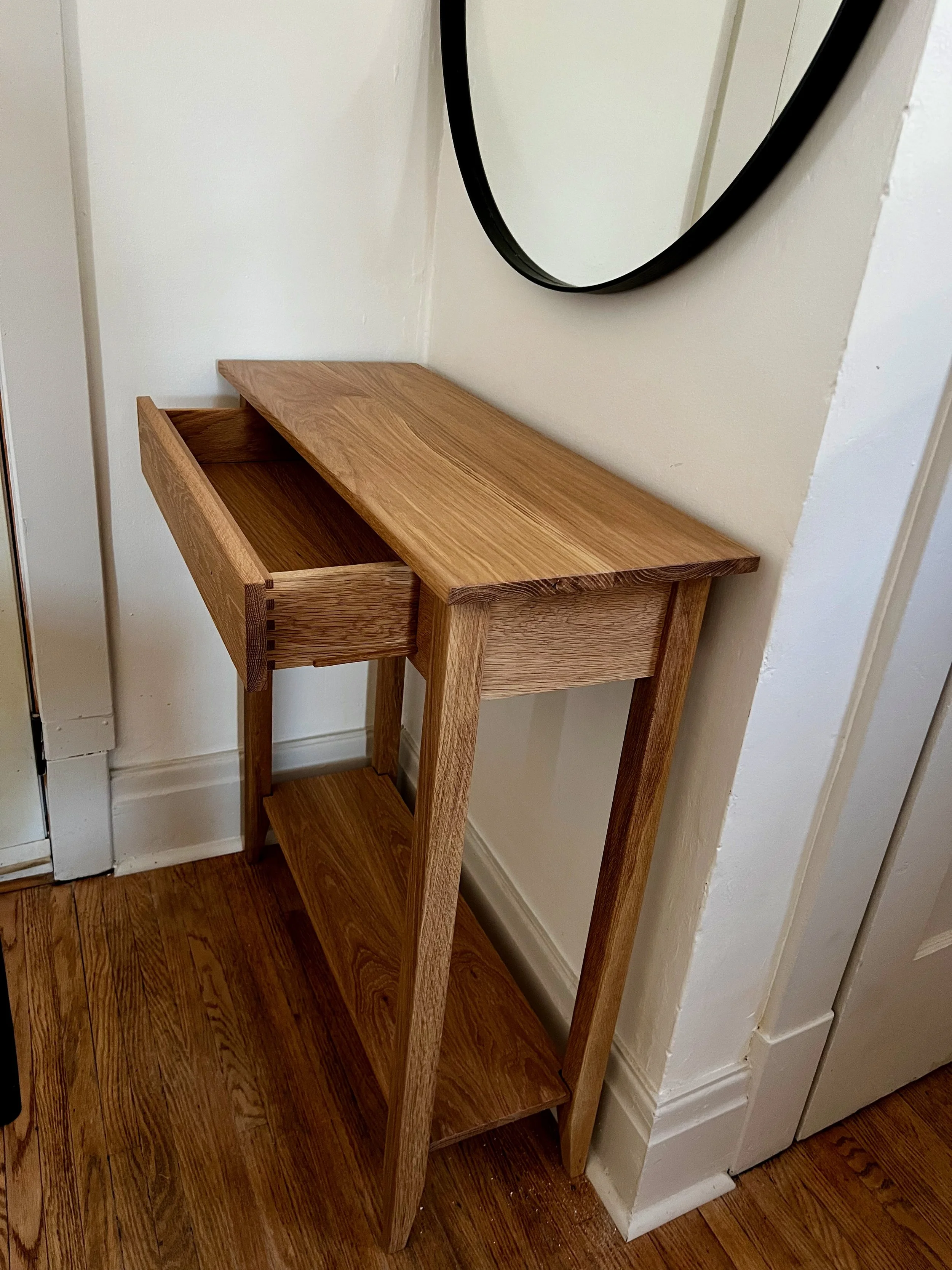 With Bookmatched Shelf and Box Jointed Drawer Box Construction.