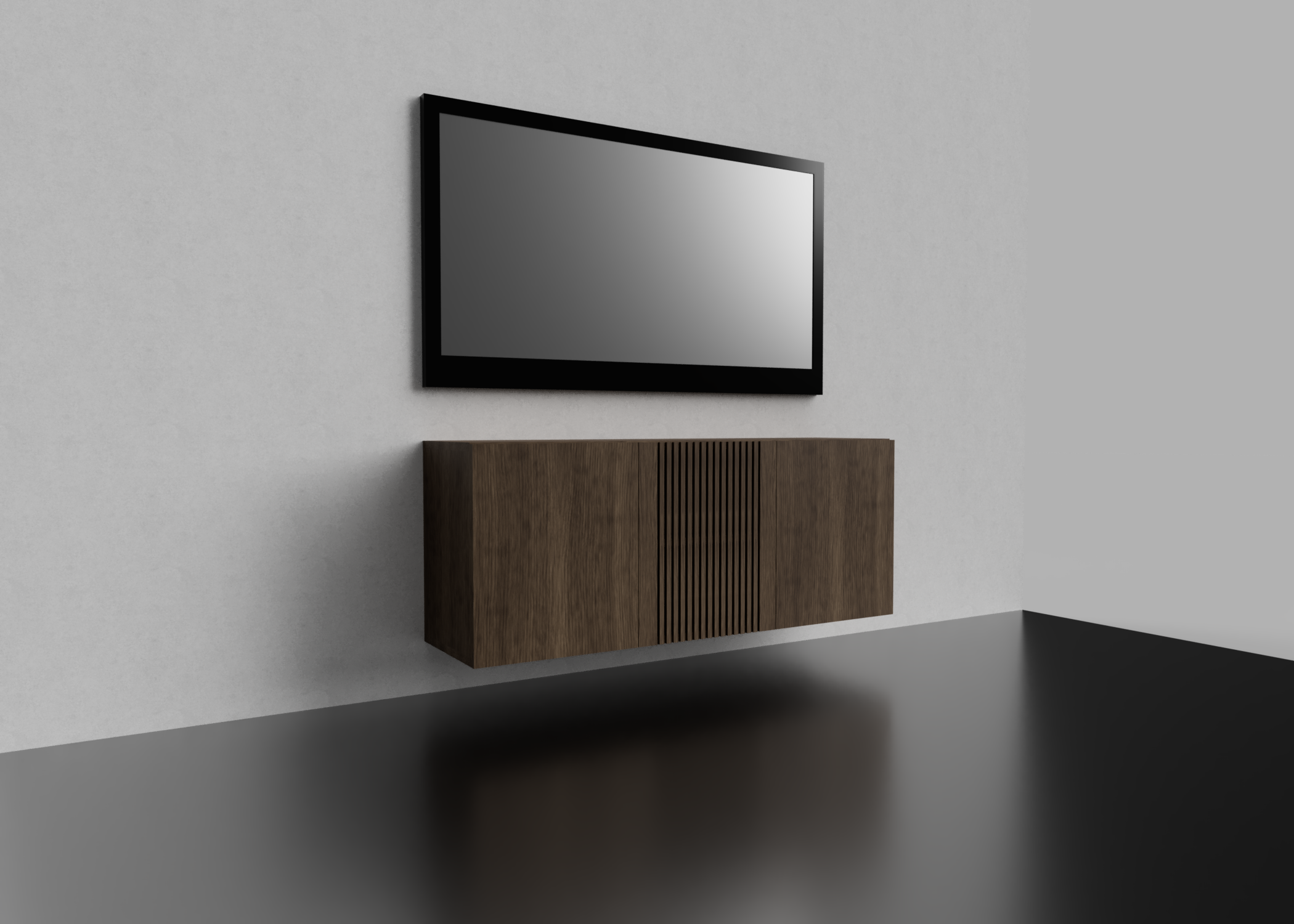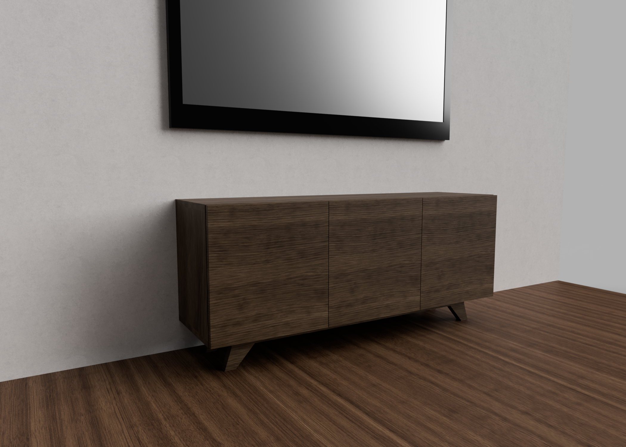 This project was in October 2023, designed and rendered in Fusion 360, and constructed with solid Black Walnut and Walnut plywood. It was revised several times during the design and render phase to ensure it would fit the space and not encroach too much on the existing living space and furniture. The main cabinet and doors were finished with Rubio Monocoat (Walnut) hard wax oil, and the leg assembly was pre-colored using Rubio Easy Pre-Colour (Intense Black) then finished with Rubio Monocoat.